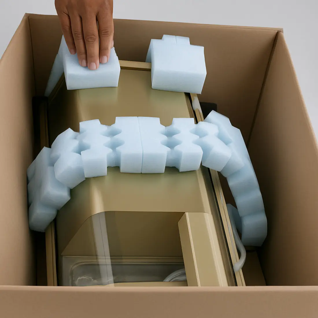 En Brafim Mecplast protegemos maquinaria sensible para la industria hotelera, como vitrinas refrigeradas con componentes electrónicos, motores y vidrio, utilizando espumas de polietileno no reticuladas (EPE) con un 65% de material reciclado. Estas espumas ecológicas ofrecen una excelente absorción de impactos y vibraciones, garantizando que los equipos lleguen en perfecto estado pese a los esfuerzos mecánicos durante el transporte. Su fabricación con material reciclado refuerza además la imagen sostenible del producto y contribuye a cerrar el ciclo de la economía circular, combinando protección, responsabilidad medioambiental y eficiencia logística.