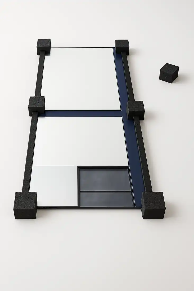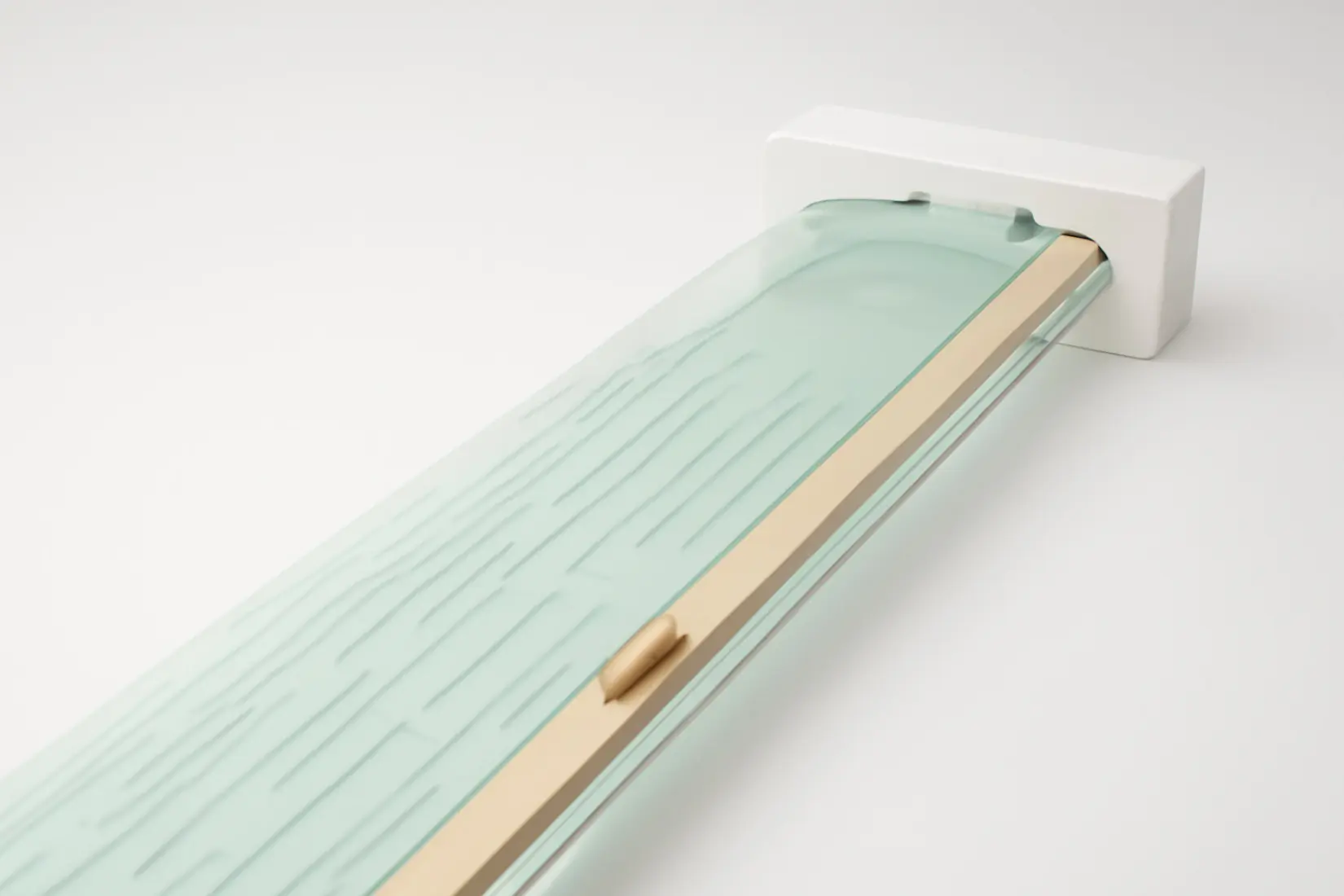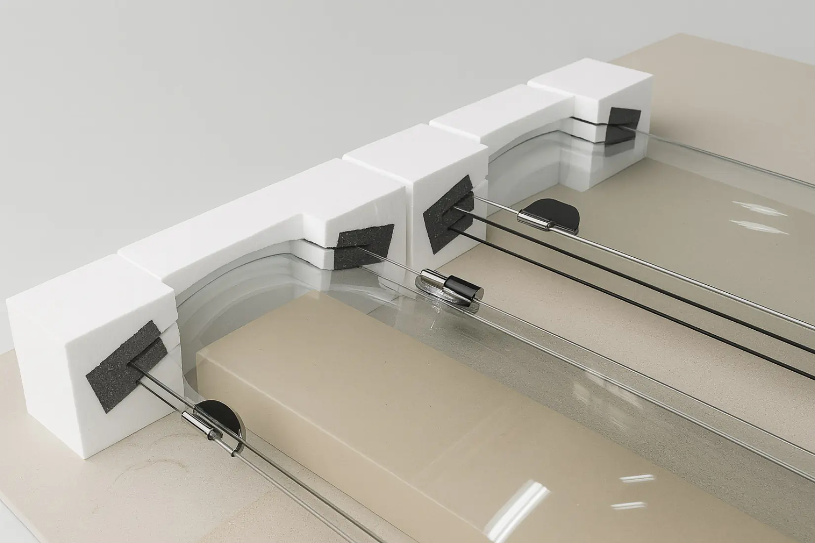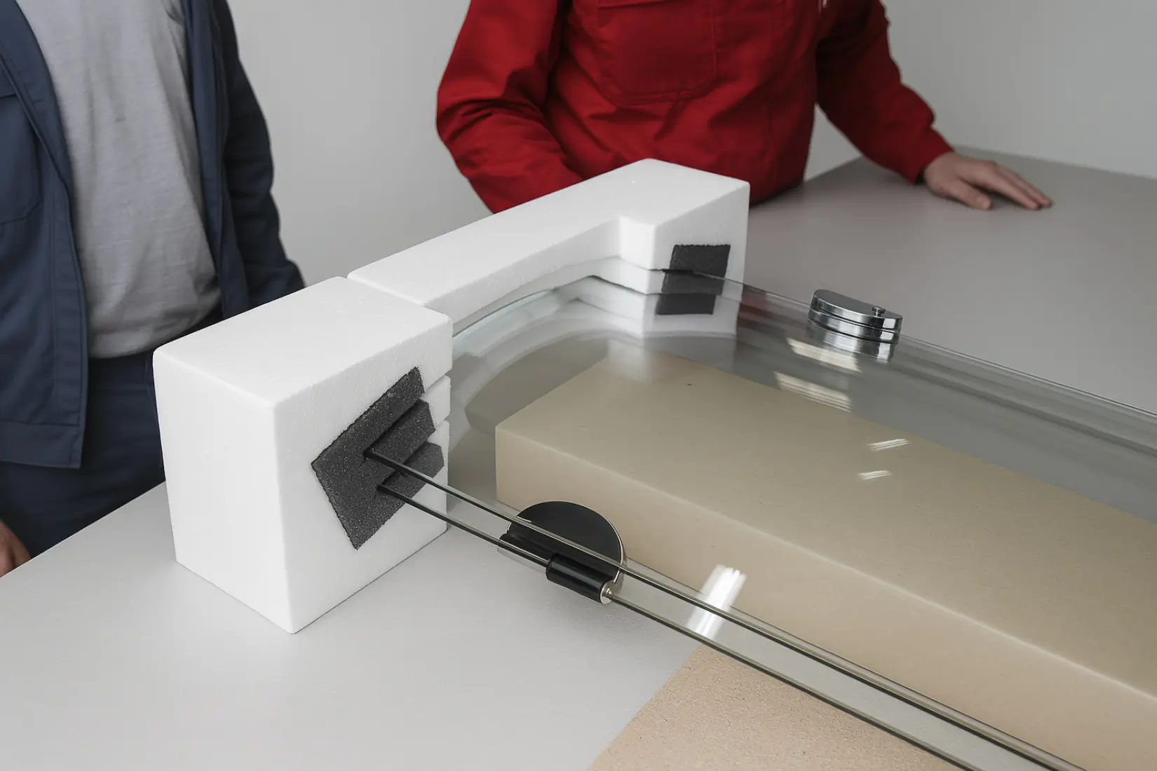 Cuando el vidrio presenta geometrías no planas —como superficies sinuosas, convexas, curvas o abombadas— el reto se incrementa, ya que estos diseños requieren apoyos específicos que se adapten con precisión a sus formas. Aquí entran en juego tecnologías de corte avanzado, como el corte por agua o el fresado de espumas técnicas, que permiten crear alojamientos tridimensionales totalmente personalizados. Estos apoyos no solo fijan la pieza de manera segura, sino que también distribuyen el peso de forma uniforme y, en muchos casos, permiten el apilado del producto sin riesgo de daño.
